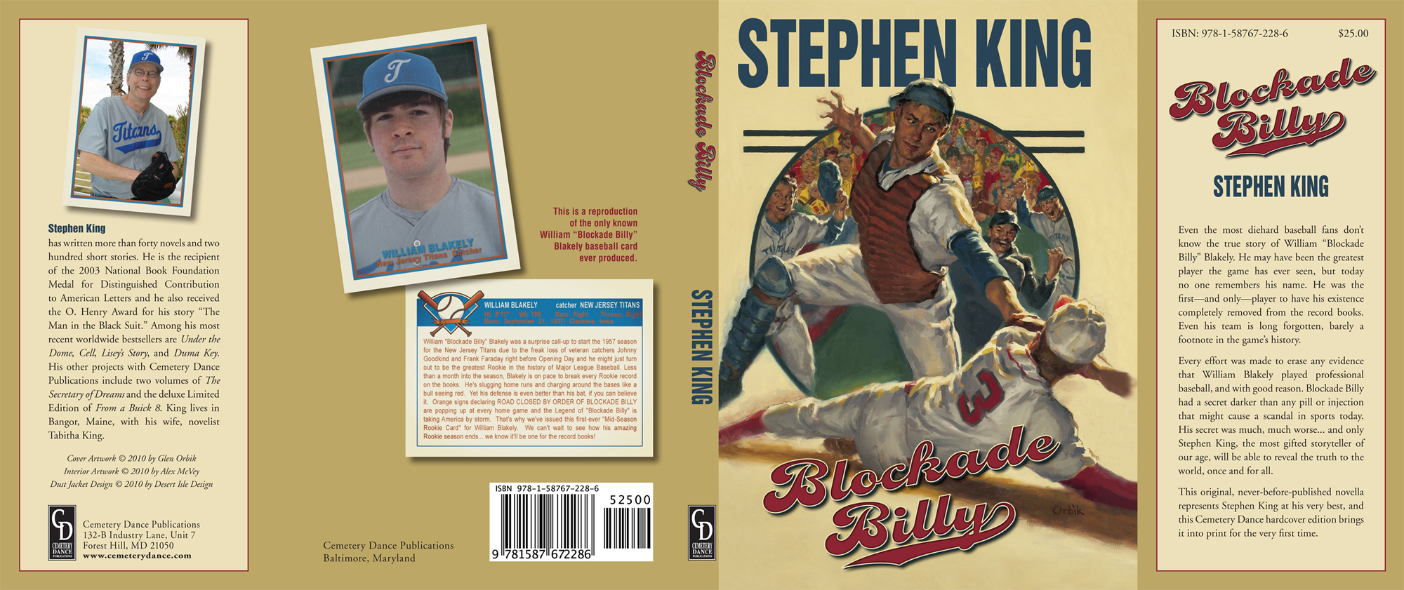 スティーヴン・キングの新しい中編"Blockade Billy"が4月20日に Cemetary Dance Publications から出版されます。また豪華装丁版が Lonely Road Books から発売される予定です。この中編は今年刊行予定の新しい中編集"Full Dark, No Stars"には収録されないので注意してください。